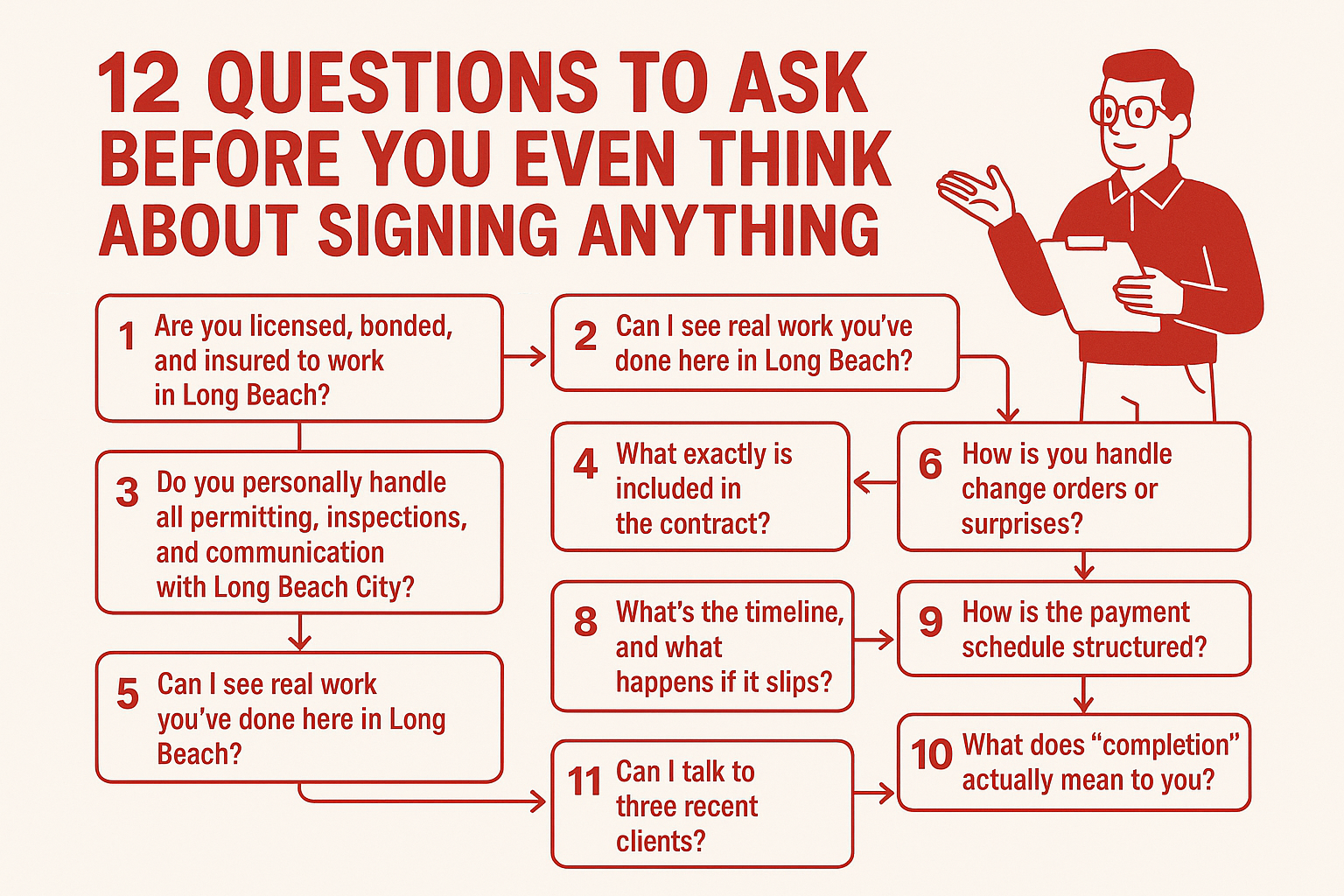 Long Beach homeowners, you’ve seen what happens when these questions don’t get asked. We’ve seen clients left mid-reno, fighting for refunds, or stuck patching up half-baked jobs. These 12 questions, they’re your shield. If your contractor can’t, or won’t, answer them clearly, keep looking.